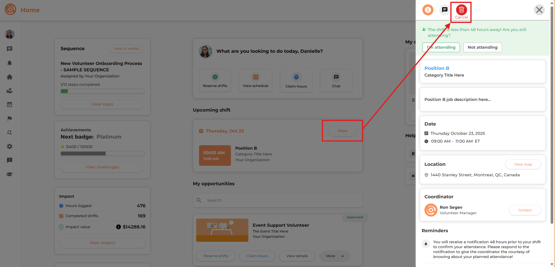 ⚠️ Please note: Once you cancel your reservation, you will not be able to reserve the same shift again. If you wish to rejoin that shift, you must contact the organization directly. Also, depending on the organization’s cancellation policy, there may be a cut-off time for when cancellations are allowed. Frequent cancellations may also affect your eligibility for future shifts.