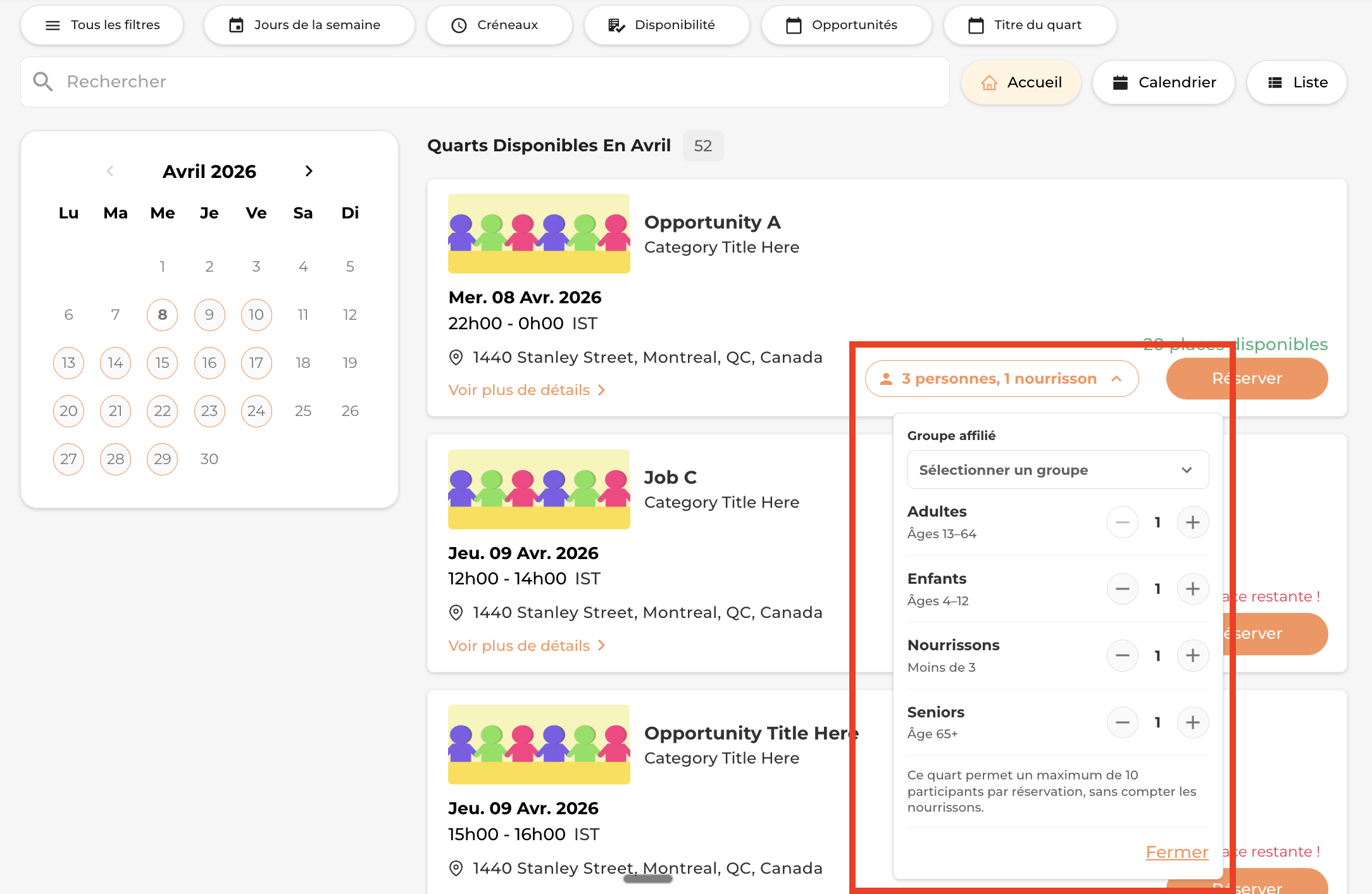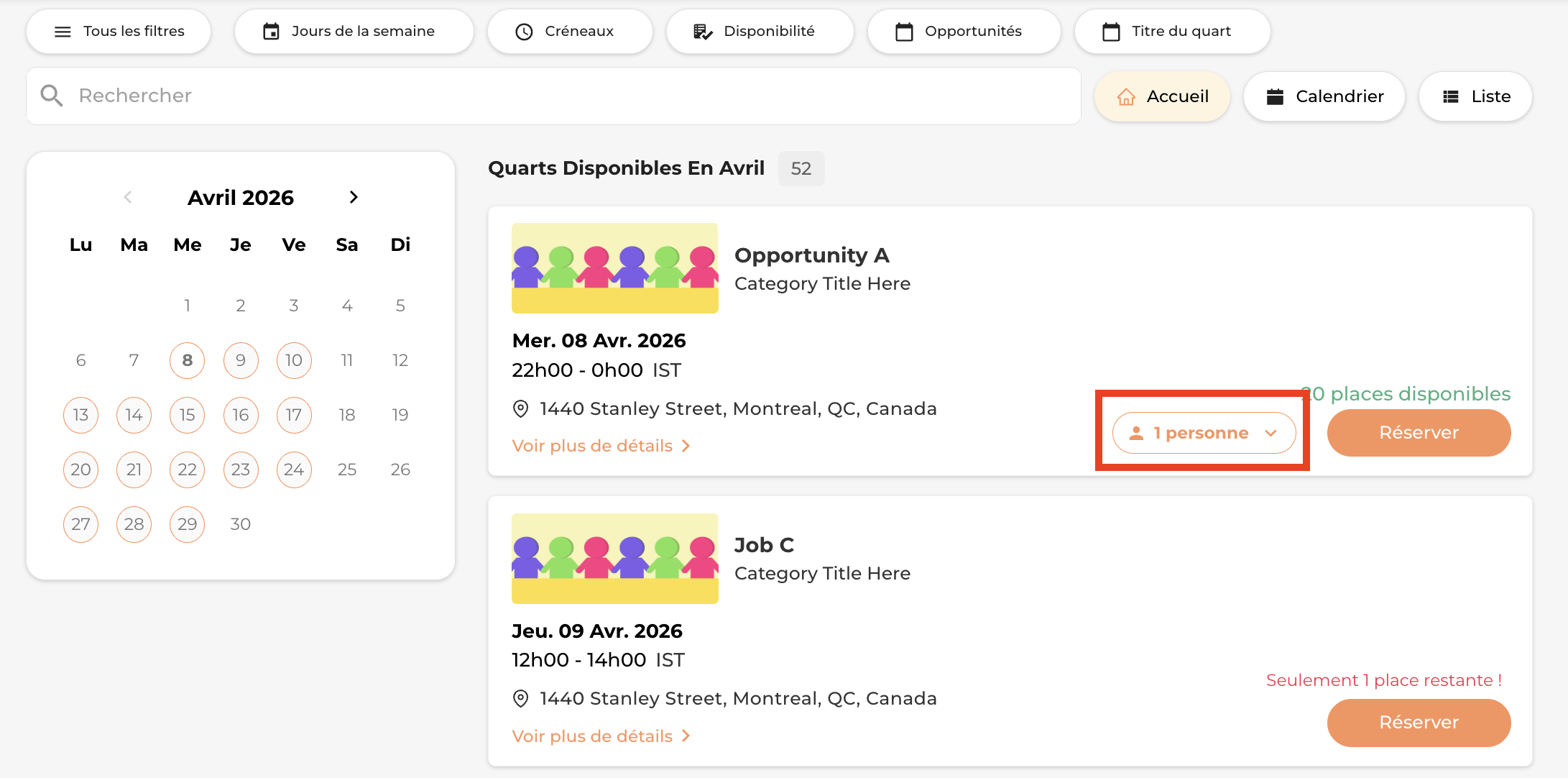 Le bouton de taille de groupe apparaît à gauche du bouton Réserver sur chaque quart. Par défaut, il indique 1 personne.