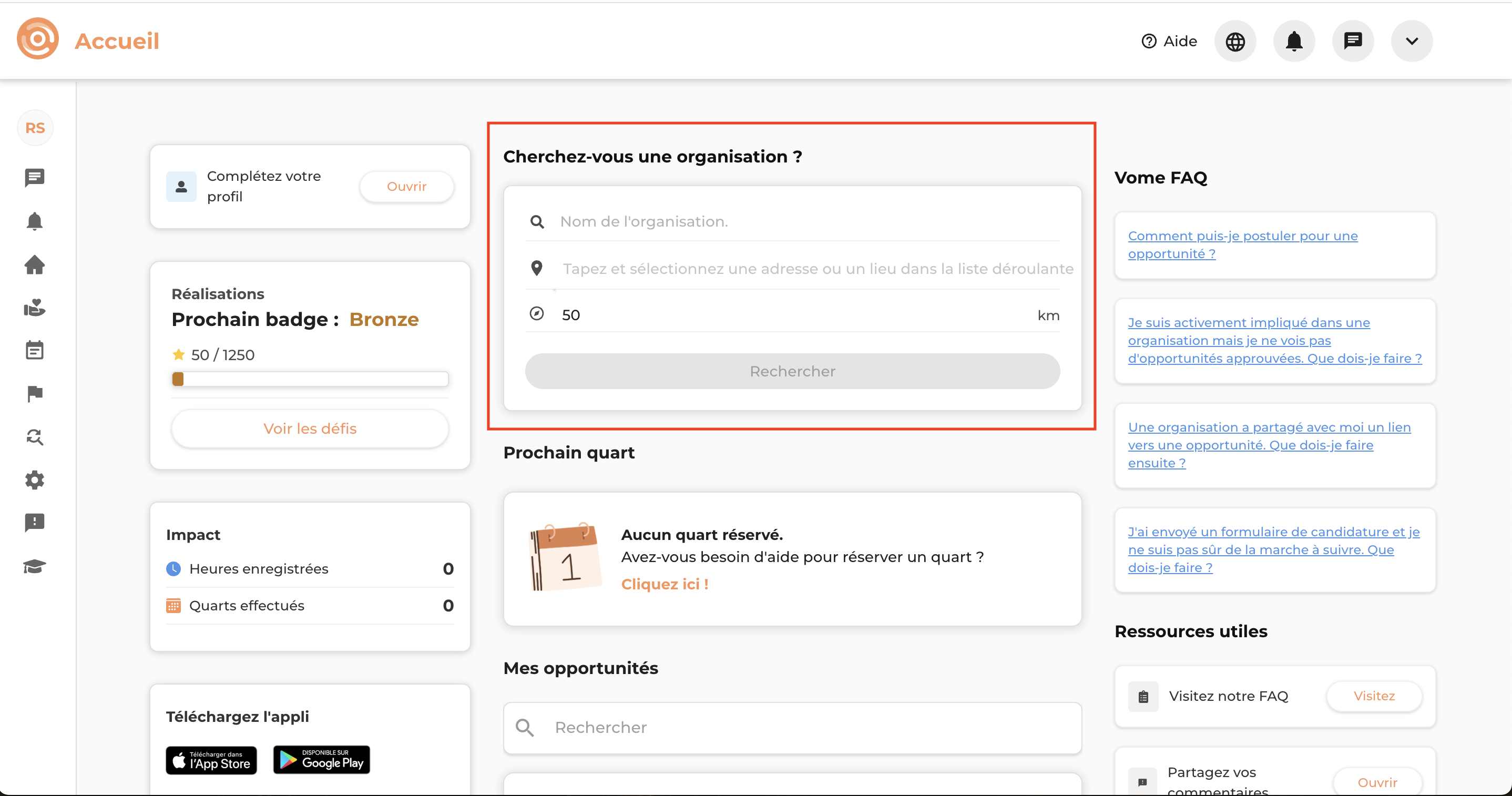 Réserver des quarts de bénévolat et suivre vos heures liées à votre implication.