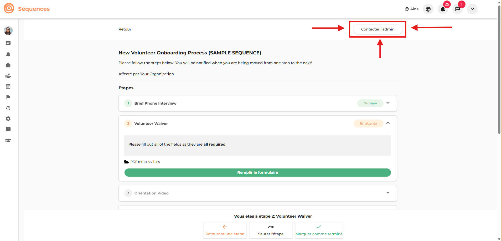 Utilisez le bouton Contacter l’admin, situé en haut à droite de votre vue Séquence.